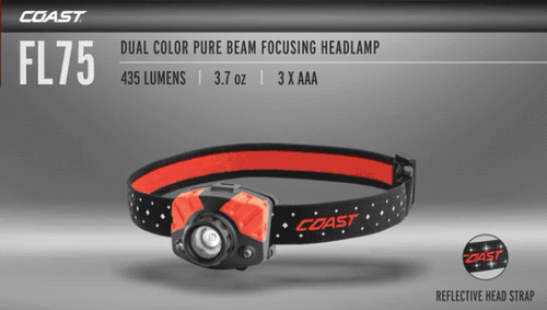 The FL75 Headlamp combines many modern Coast beam features into one front-loaded headlamp. The first button on the headlamp gives you the ability to shine an ultra wide flood beam and then quickly twist the bezel to a long reaching spot beam with transition halo. The second button on the headlamp enables the user to switch rapidly to a fixed red LED light to preserve night vision. Built with an IPX4 weatherproof rating and equipped with a reflective safety strap, this light is ready for any environment.