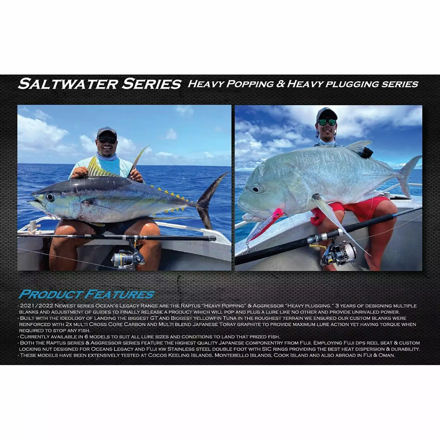 The Aggressor “Heavy Plugging” was 3 years in the making. After testing multiple blanks with variation on guide placements, Ocean’s Legacy is proud to release a product that will plug a lure unlike any other rod and provide unrivalled power. Built with the ideology of landing the biggest GT and the biggest of yellowfin tuna in the roughest seas, we ensured our custom blanks were reinforced with 2x multi Cross Core Carbon and multi blend Japanese Toray graphite to provide maximum lure action yet having torque when required to stop any fish. The Aggressor series features the highest quality Japanese componentry from Fuji. It employs Fuji DPS reel seat and custom locking nut designed for Ocean’s Legacy as well as Fuji KW stainless steel double foot with SIC rings to provide the best heat dispersion and durability. Extensively tested at Cocos Keeling Islands, Montebello Islands, Cook Island and also abroad in Fiji and Oman.