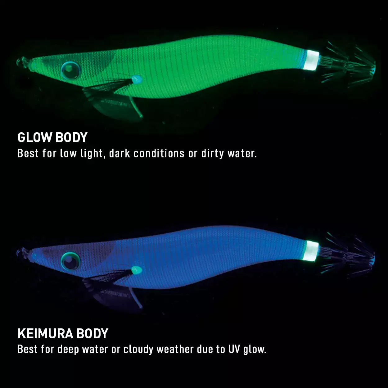 The Shimano Sephia Egixile squid jigs are available in the NEW standard BB range. Established as a highly effective jig amongst Australian EGI anglers, the Shimano Sephia Egixile range has been revamped and relaunched by teaming up with Shimano Japan to deliver a unique Australian offering, inspired by local baitfish. Models are available in Glow and Keimura UV bodies and the range is now available in new colours based off native Australian baitfish, The BB is identified by the blue packaging, with a blue glow eye and feather, making Shimano Egixile jigs more attractive to squid than ever. The standard BB range is available in 3 sizes (2.5, 3.0 & 3.5) and twelve colours. All models feature a high quality SUS 304 Japanese stainless Crown for sharpness, strength and rust resistance.